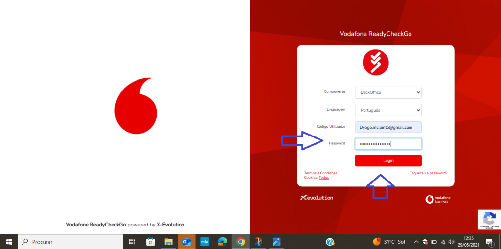 Para efetuar o login , aceda ao link [ambiente].vrcg.pt , onde substituimos o [ambiente] pelo nome da empresa utilizando um browser